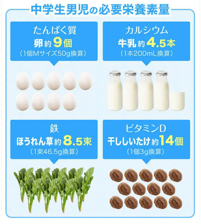 中高生の栄養補給に特化しているので買ってみました。息子は中学3年生で成長期終盤に差し掛かっているので心配でしたが、今後が楽しみです。